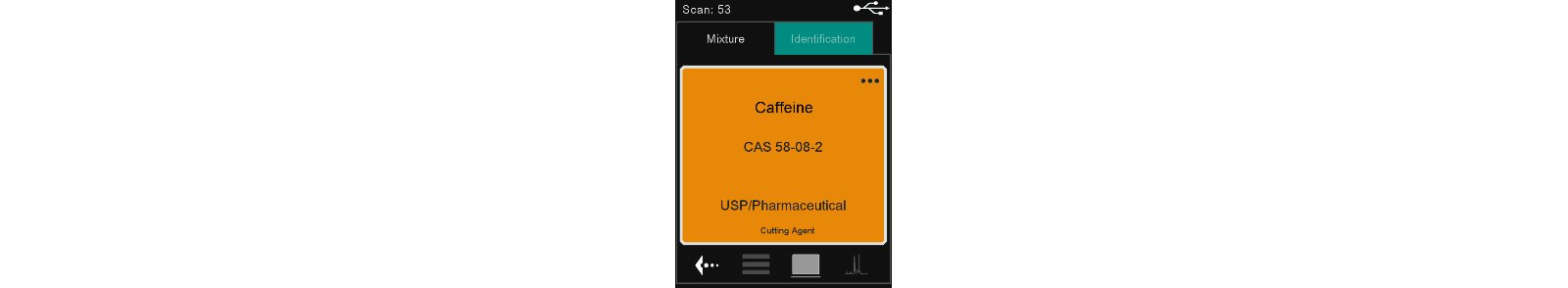 Figure 2. Actual screenshot of identification of caffeine in Yaba with MIRA DS. Caffeine is a chemical commonly associated with illicit drugs. The yellow warning background provides immediate, actionable information about the nature of the sample.