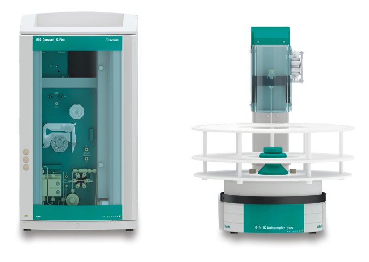 Figure 1. Instrumental setup including a 930 Compact IC Flex with the IC Conductivity Detector MB (L) and the 919 IC Autosampler plus (R).