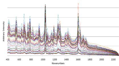 From this initial data set, 20 random spectra were chosen to better display spectral variation of the heterogeneous samples assayed with the ORS OFF (Figure 3):
