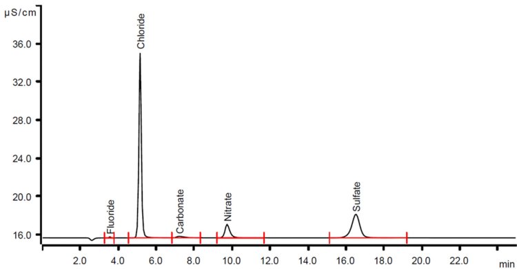 The calibration ranged from 0.05–2.50 mg/L for fluoride, nitrite, bromide, and phosphate, from 1–50 mg/L for chloride and nitrate, and 5–100 mg/L for sulfate.