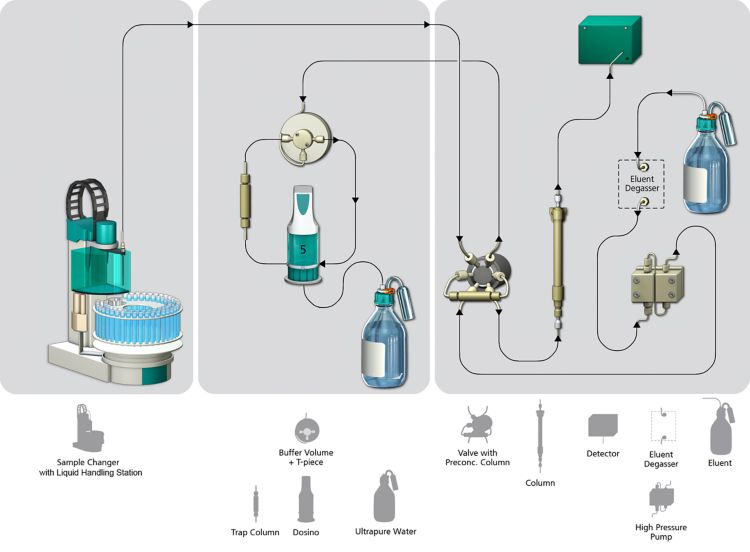 The 858 Professional Sample Processor processes samples from 500 µL to 500 mL. The sample transfer takes place either by means of a peristaltic pump on the 850 Professional IC system or with an 800 Dosino.