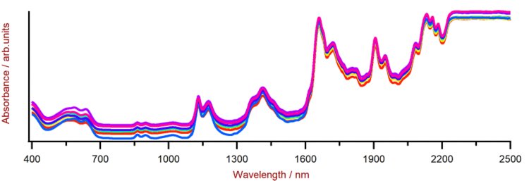 Figure 2. Selección de espectros PET Vis-NIR obtenidos con un analizador DS2500 y un vaso de muestra grande DS2500 giratorio. Por razones de visualización, se aplicó una compensación de espectros.