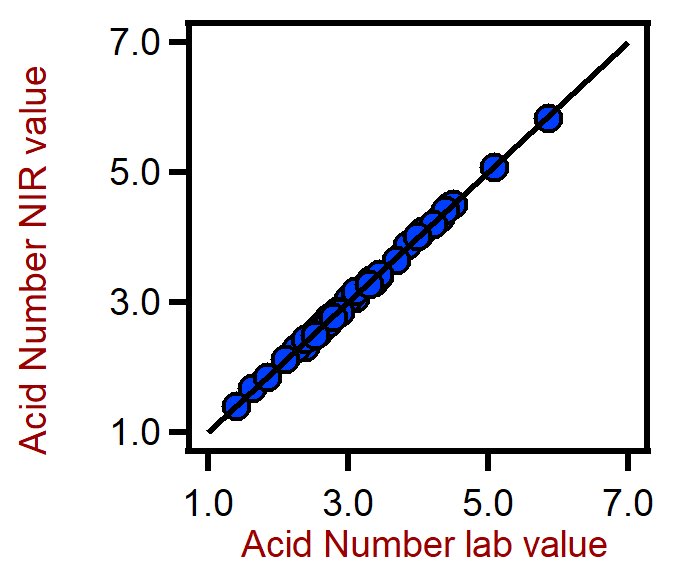 Figure 6. Diagrama de correlación para la predicción del índice de acidez en PET utilizando un analizador de sólidos DS2500. El valor de laboratorio del índice de acidez se evaluó mediante titulación.