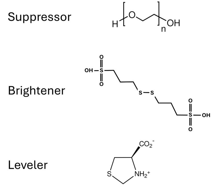Los supresores, abrillantadores y niveladores son aditivos esenciales en el proceso de galvanoplastia de cobre (Figura 3), cada uno con una función específica [1].