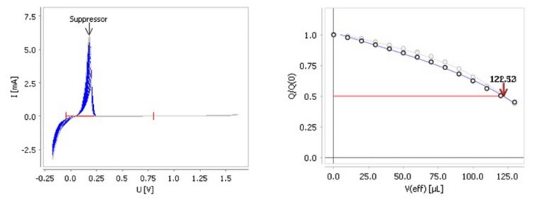 Dado que el supresor ralentiza el recubrimiento de cobre, agregar más cantidad hace que el pico de desprendimiento de cobre sea más pequeño (Figura 6). Este cambio se utiliza para crear una curva de calibración.