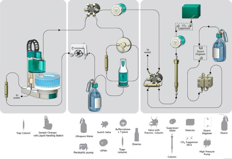 Il sistema Professional IC Vario con neutralizzazione in linea Metrohm, tecnica di arricchimento in linea intelligente di Metrohm ed eliminazione della matrice in linea nonché soppressione sequenziale e rilevazione della conducibilità consente l'analisi di anioni in matrici complesse dal range di ultratracce fino a mg/L.