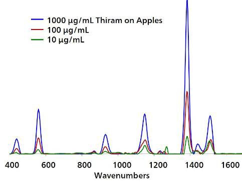 Overlaid and baseline-corrected spectra acquired for swabs of an apple skin treated with different concentrations of thiram show detection down to 10 μg/mL (Figure 2).