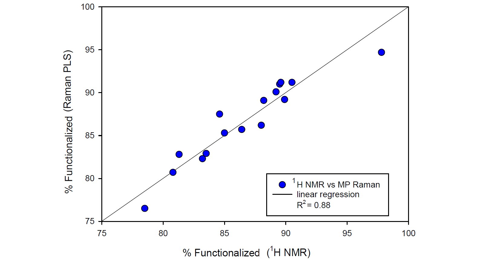 A simple peak height ratio analysis is used to evaluate the quality of the Raman data to determine polymer functionalization. Twelve samples that varied in the extent of polymer functionalization as determined by 1H NMR spectroscopy were selected. Next the single point peak height intensities of the second derivative spectra at 1126 and 1005 cm-1 are determined. The peak height analysis of the two components (i = initial, f = final) utilized the ratio of these two unique bands for component band f divided by the sum of the two component bands (i + f). The expected range of this ratio will be 0 to 1, where 1 corresponds to a 100% functionalized polymer. This simple univariate band ratio analysis resulted in very good linearity (see Figure 2) confirming the suitability of the Raman spectral data to develop a robust quantitative PLS1 model.