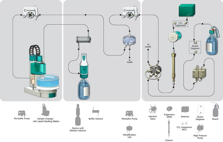 The Professional IC Vario system with Metrohm Inline Dilution, Metrohm Inline Ultrafiltration, sequential suppression and conductivity detection enables fully automatic determination of anions or cations that are present in very high concentrations and that have matrices containing particles.