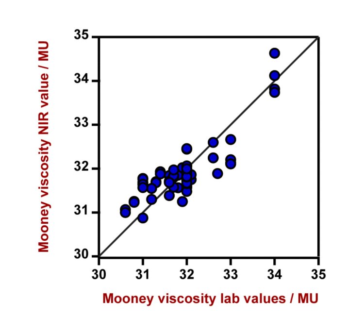 All measured Vis-NIR spectra (Figure 2) were used to create a prediction model for quantification of the key quality parameters of BIIR. The quality of the prediction model was evaluated using correlation diagrams which display a very high correlation between the Vis-NIR prediction and the reference values. The respective figures of merit (FOM) display the expected precision of a prediction during routine analysis (Figures 3–7).