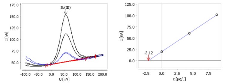Figure 8. Example of Sb(III) determination in NB1 containing 100 µg/L Sb(III) with the Hg-free scTRACE Gold electrode (deposition time 30 s, sample volume 250 µL, result: 95 µg/L). The sample was diluted prior to analysis.