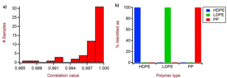 Figure 3. Correlation value histogram for the identification of the individual polymer types. (b) All polymer types in the sample set were identified correctly.